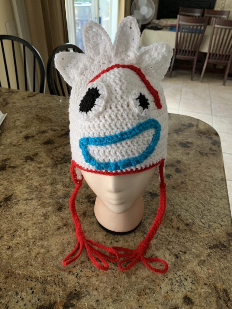I dug into my yarn stash and made him a Forky hat. It may be a bit big, but I have plenty of time and yarn to make a smaller one. Unfortunately, it will be a bit before I can set this little hat on his cute red curls.