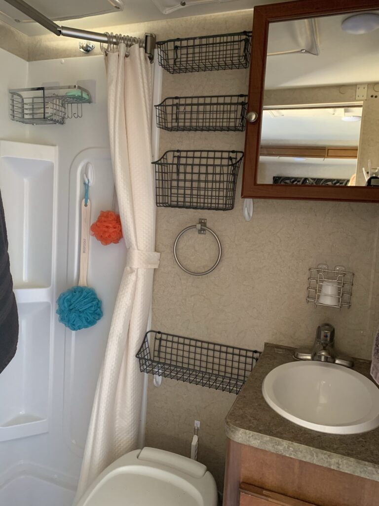 I promised the hubby that I wouldn’t do anything to this new camper. I had my fingers crossed behind my back. It started out pretty minor. The first thing I did was move the medicine cabinet up about 4 inches. We are both tall. I couldn’t see anything above my chin with the cabinet where they’d hung it. That just was NOT going to work.