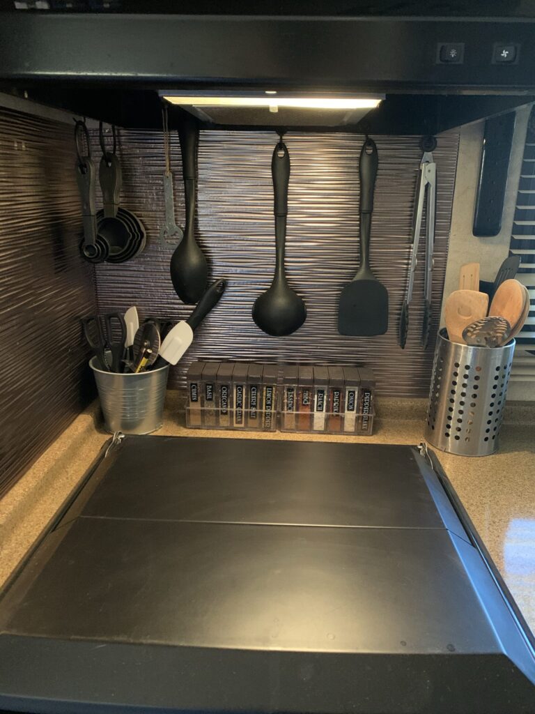 I added more spice containers and magnetic hooks for utensils in the stove area:
