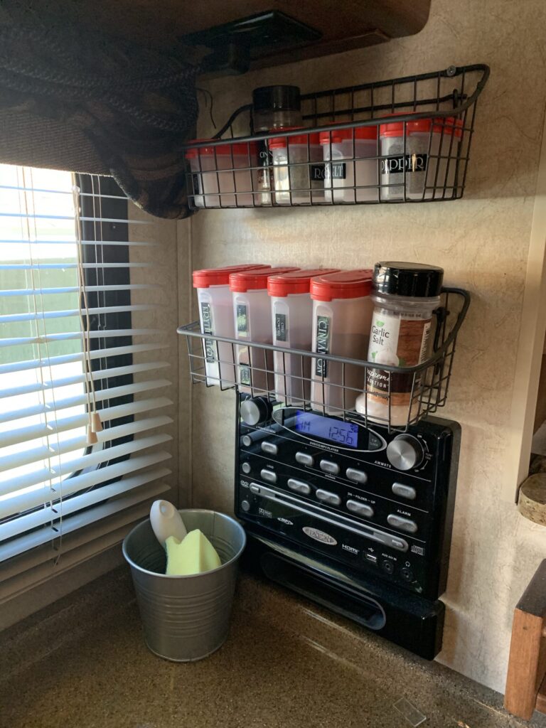 I stuck them down to the cabinet with Nano tape. Nano tape is fantastic for traveling in campers. I used it on the back of Command hooks, because Command tape is, well, pretty expensive. I use it to stick my soap dispensers, hand sanitizer, and coffee syrups to the counter. I don’t know that I’d trust it to hold really important or heavy things or if the temperatures in your camper are extremely hot or cold, but I like it and carry a couple of rolls with us: